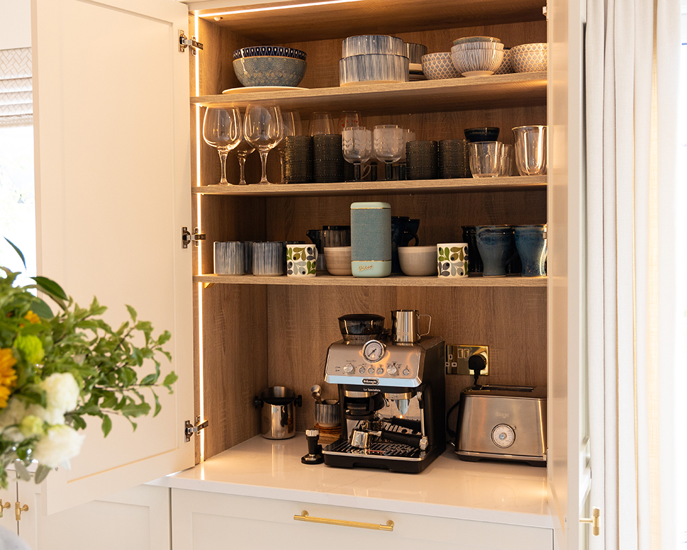 Picture yourself at the island, holding a freshly brewed coffee from your very own tea/coffee station, while the gentle radiance of its LED strip illuminates you.