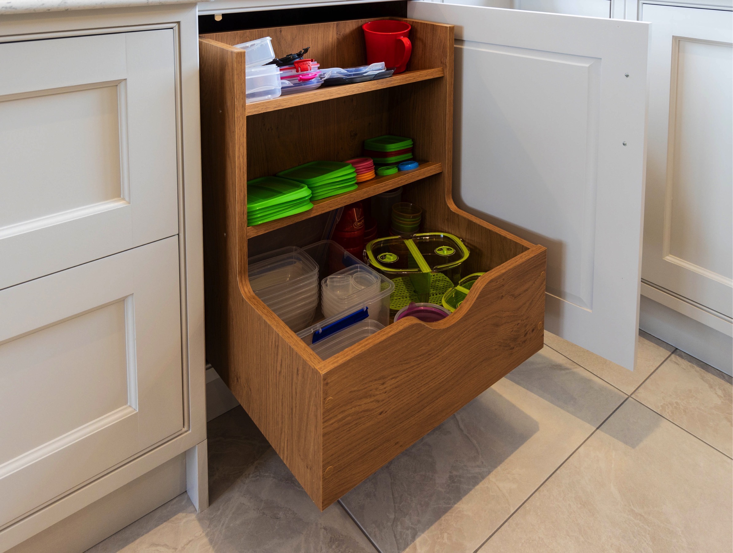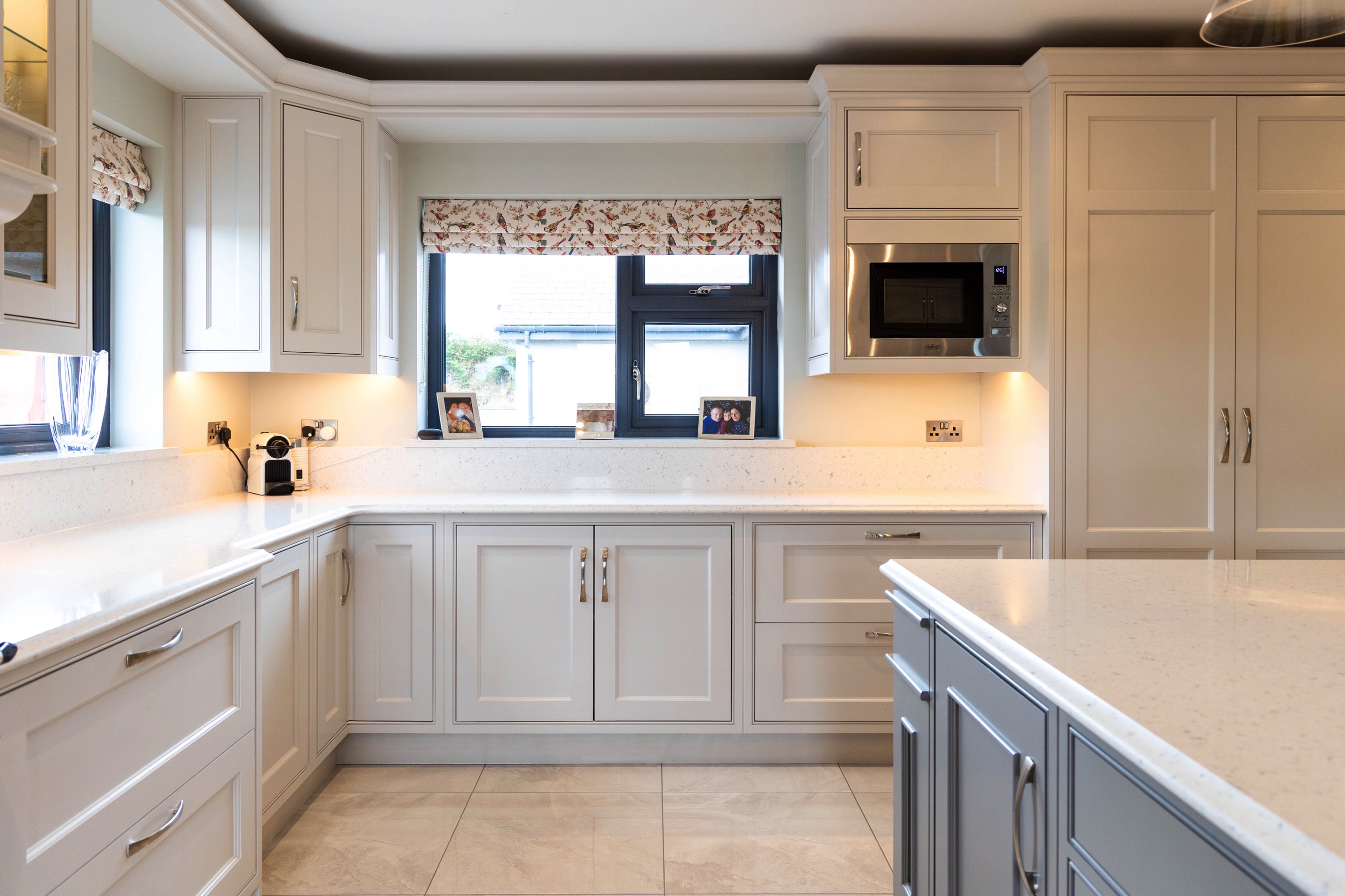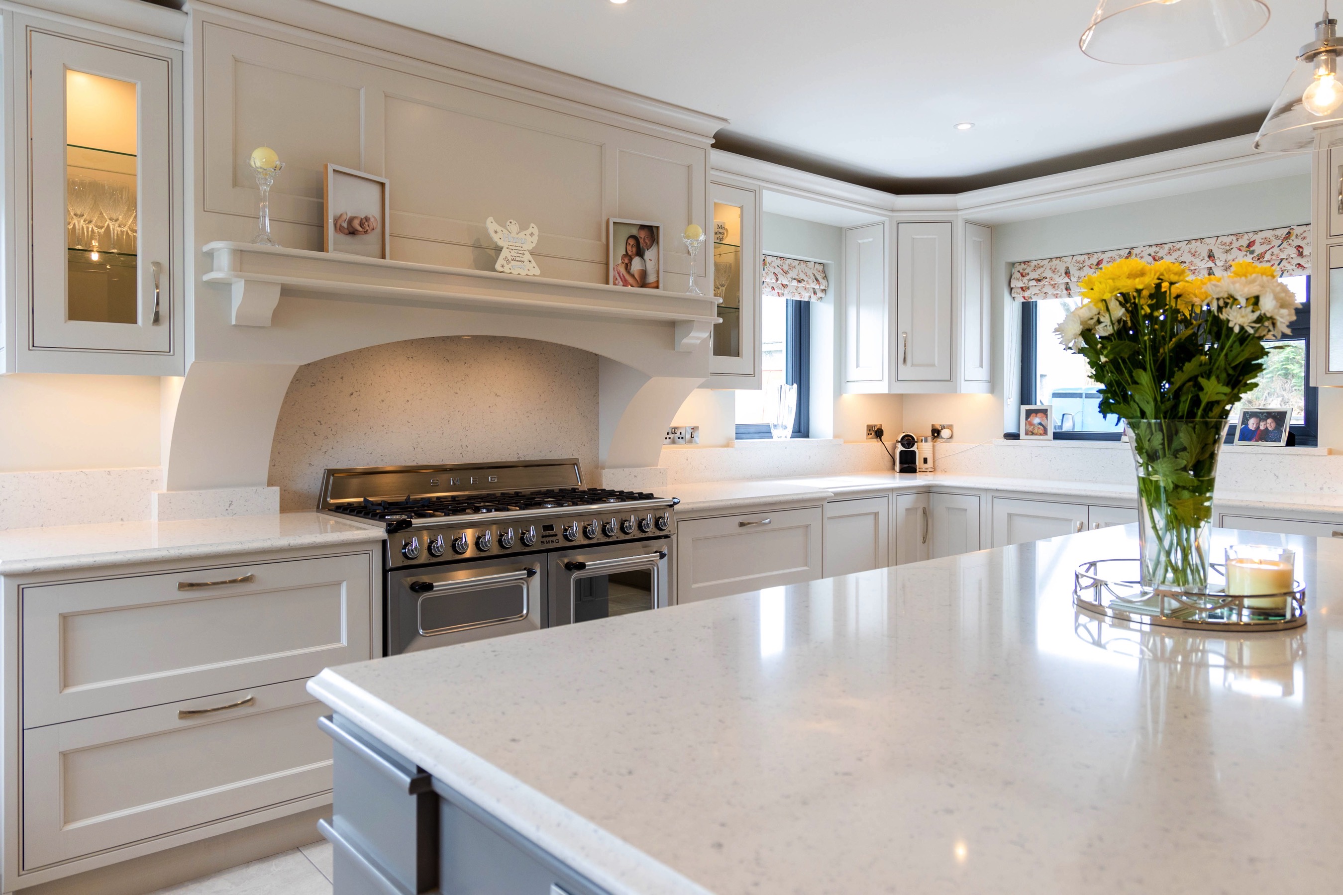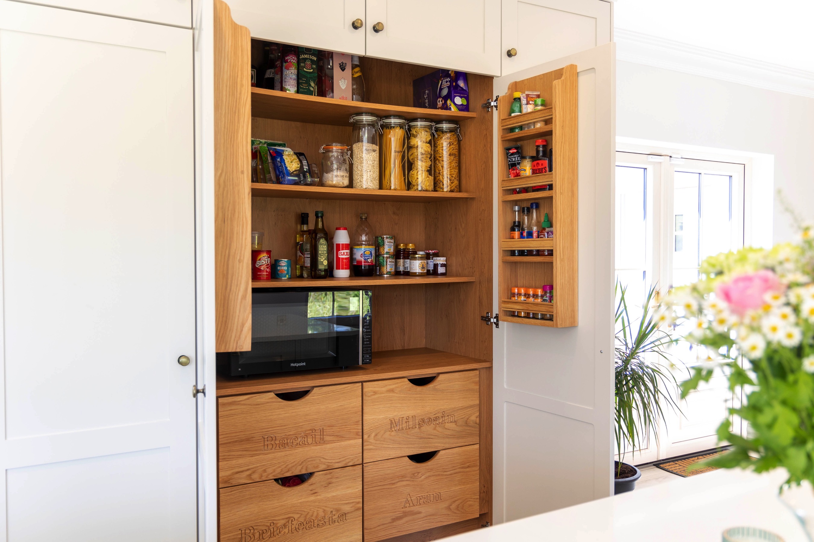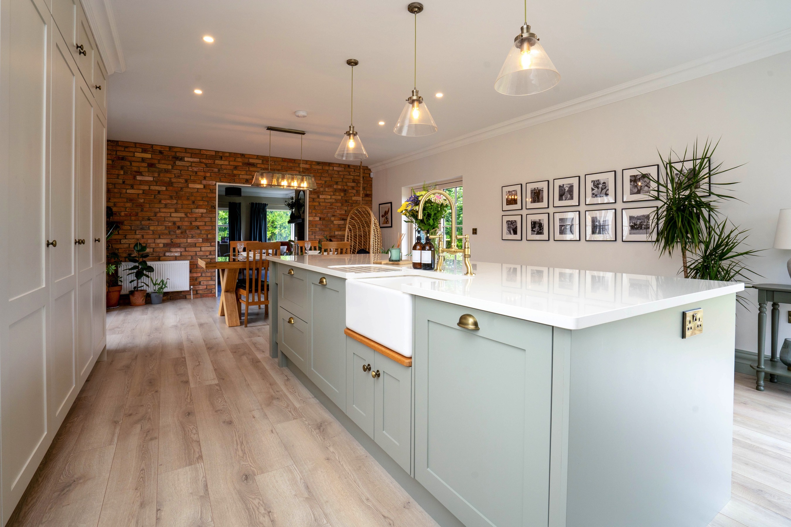 In keeping with its location and style of home, we love how a modern style shaker kitchen with some soft colour tones has helped tie this whole room together. Plants in a room are often undermined, but bring a great sense of freshness, particularly when paired with some bronze resources, like a kitchen tap and door handles. We also love the customer request to engrave the pantry drawers and put a unique stamp on the room.