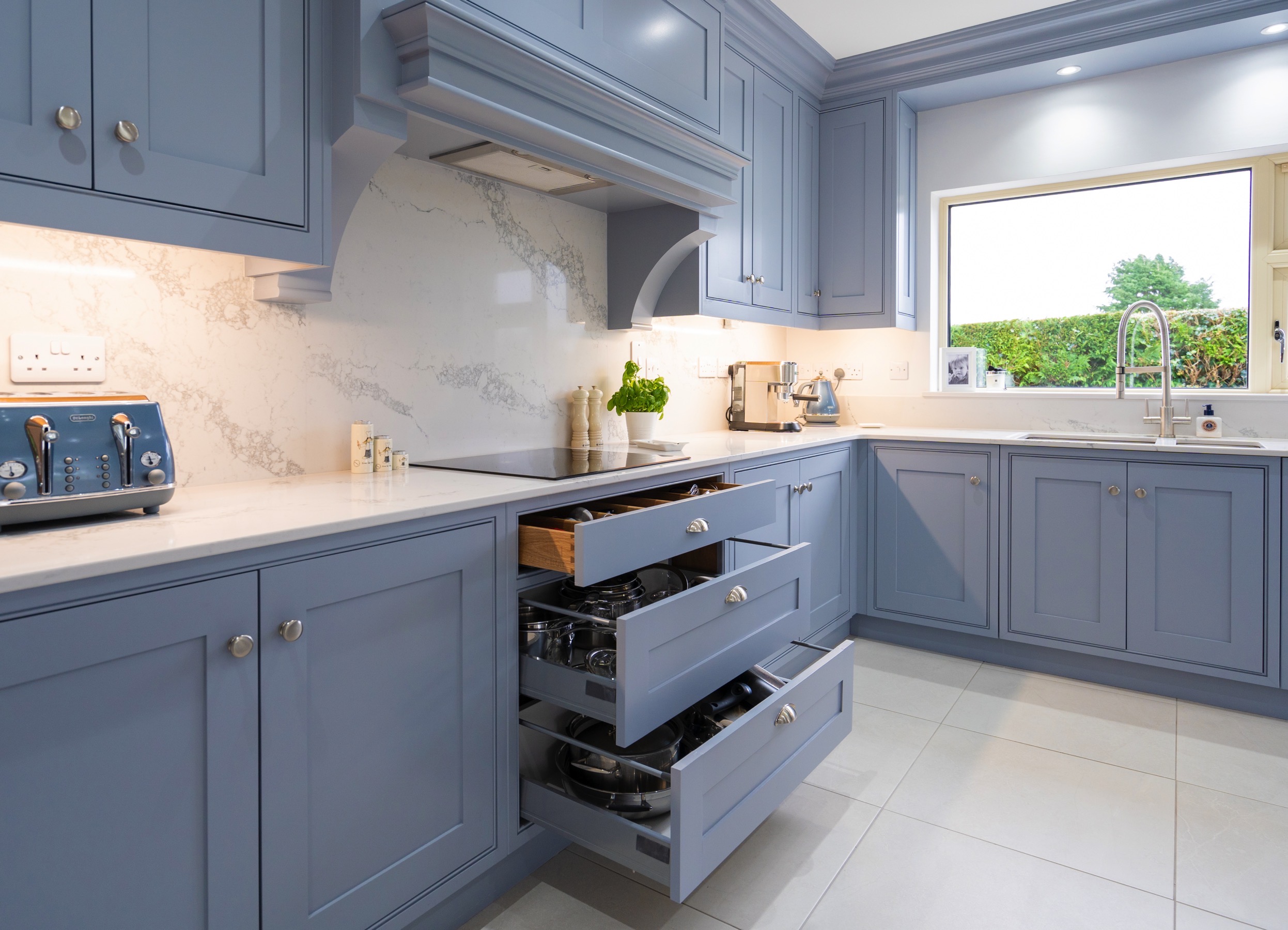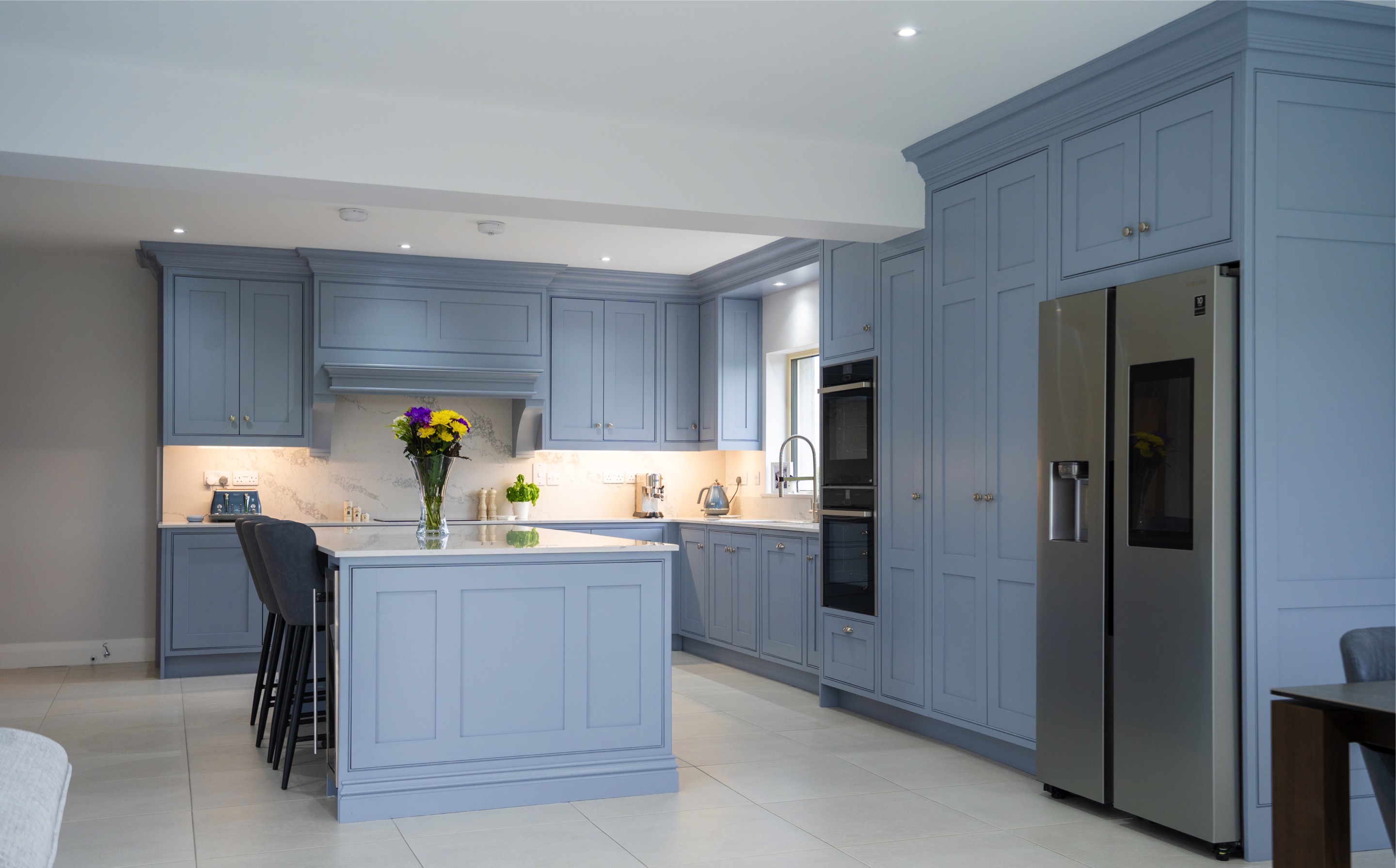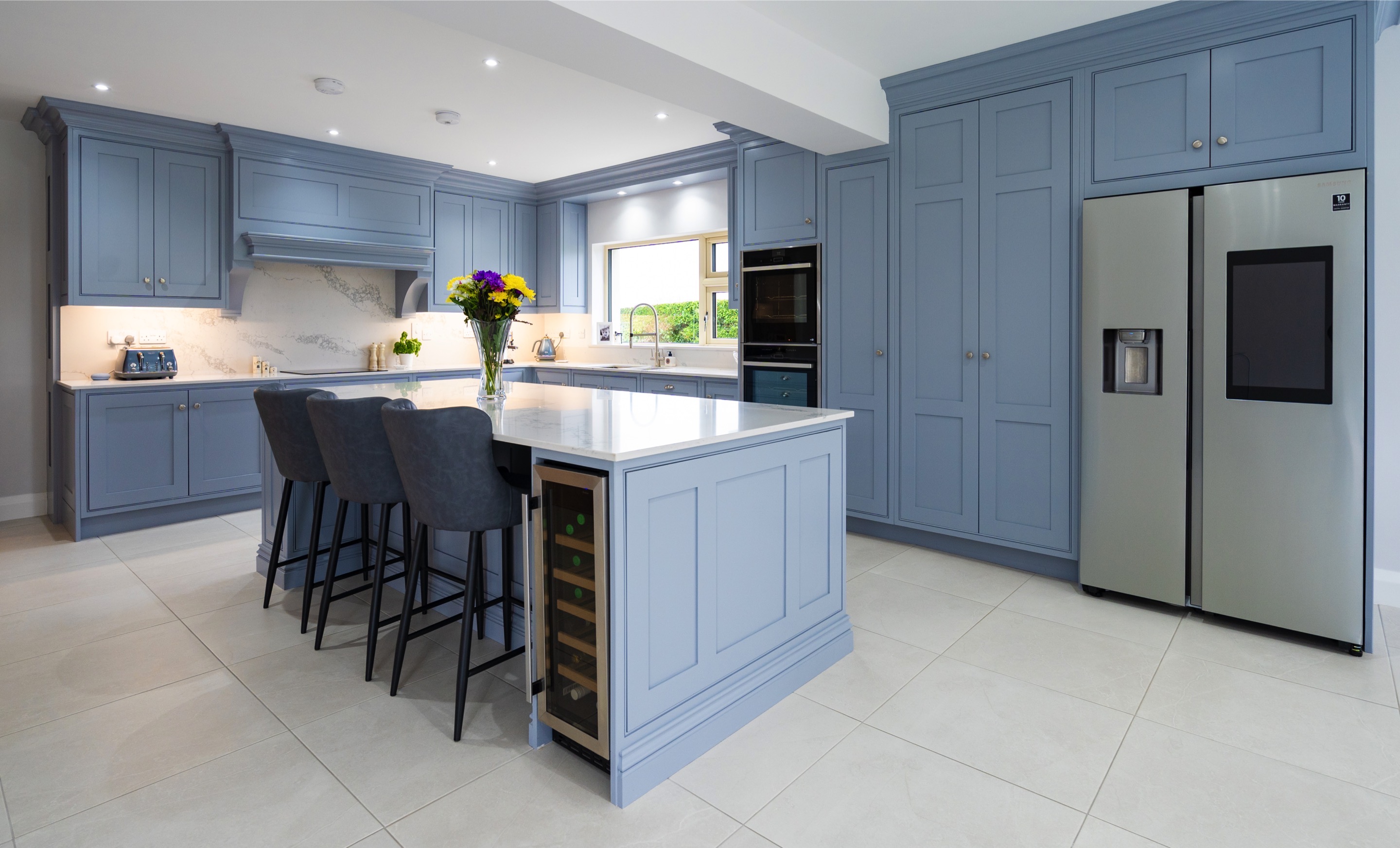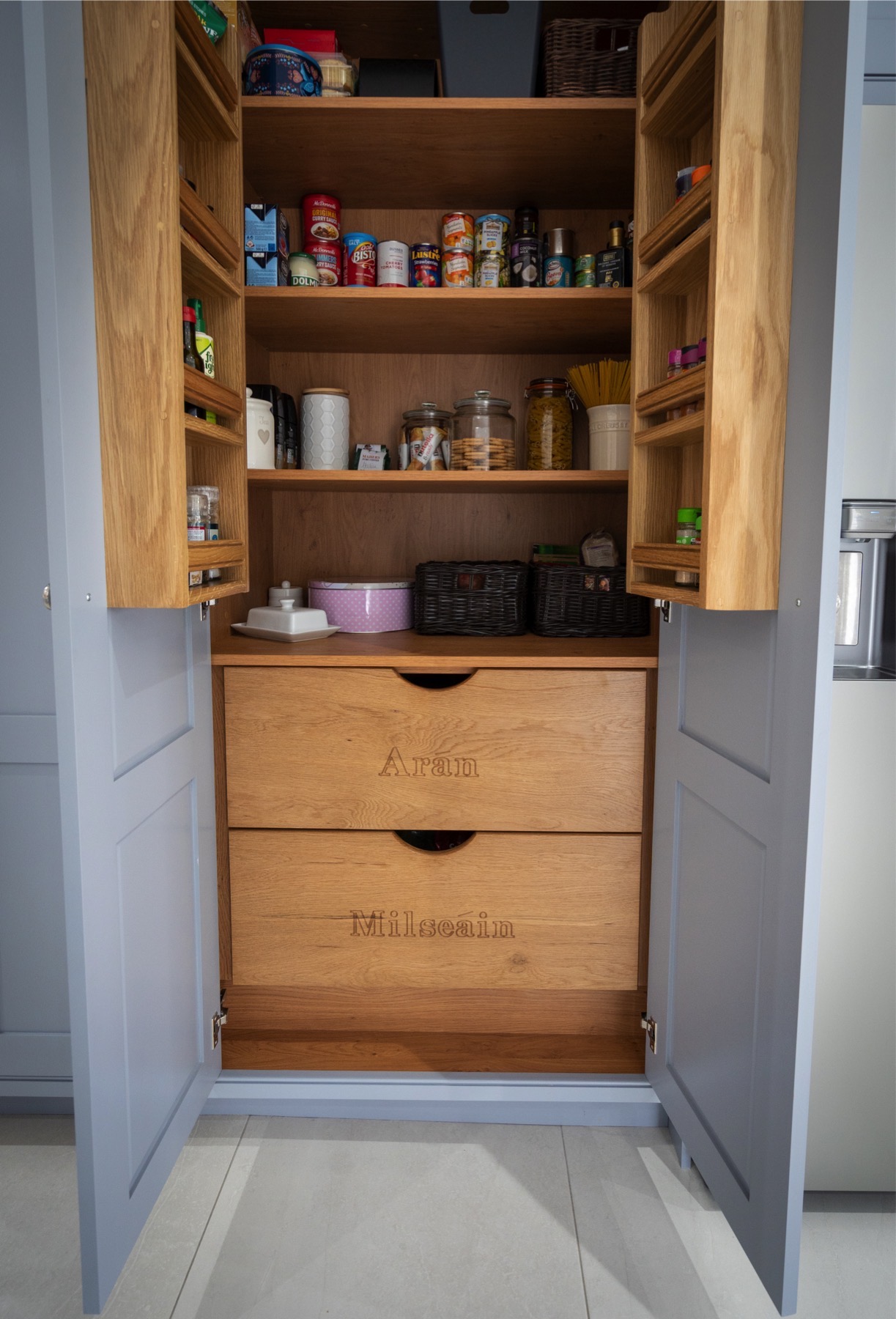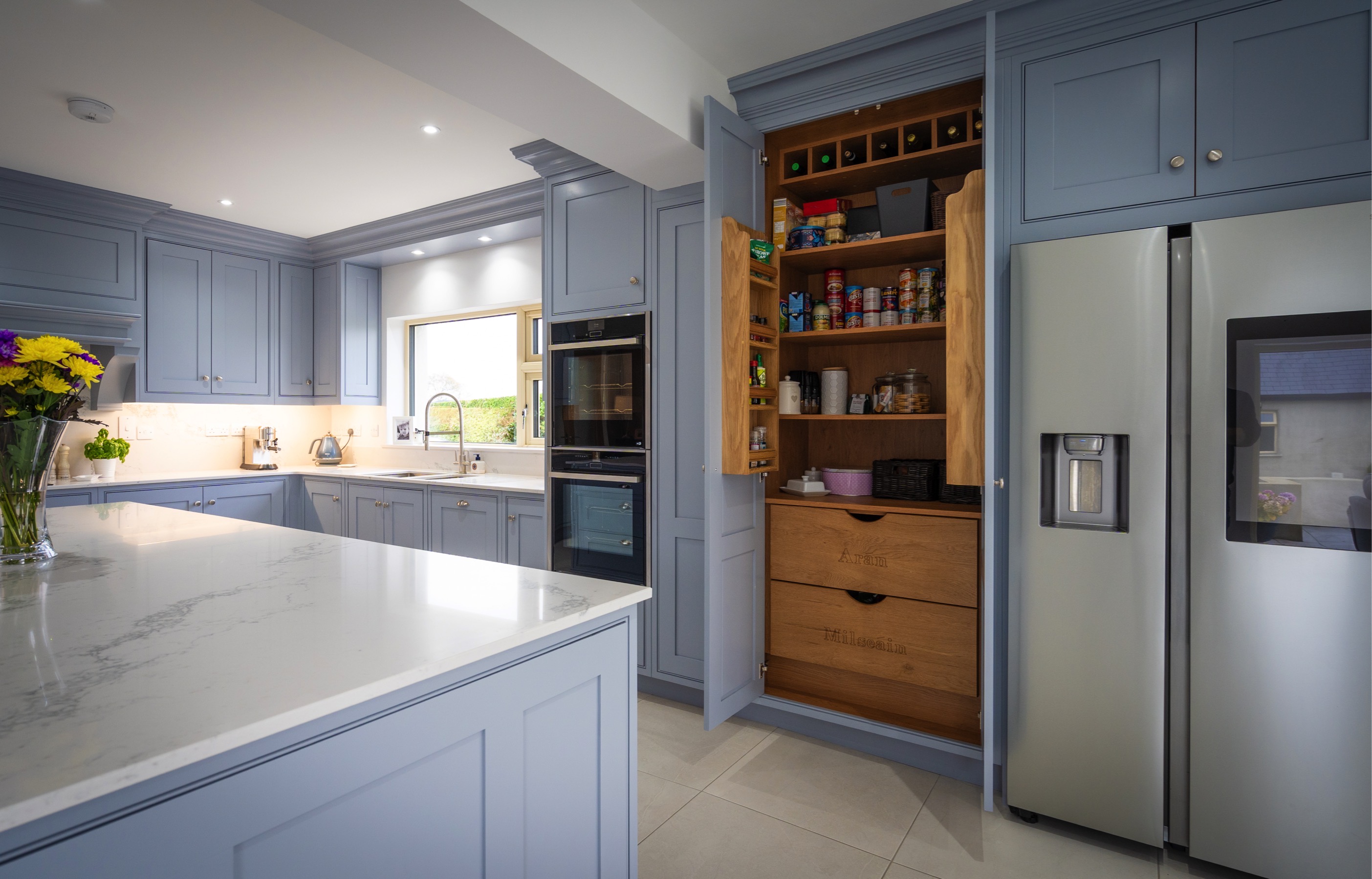 A recently completed project that truly shows Irish Handcrafted Kitchen dreams come true. With ample storage for all the usual kitchen essentials, this handcrafted pantry with its personalised Irish engraving gives this kitchen a sense of real character that reflects upon its quality and its place within the Irish home. Stunning colour scheme that are calming and rewarding to this beautiful home.